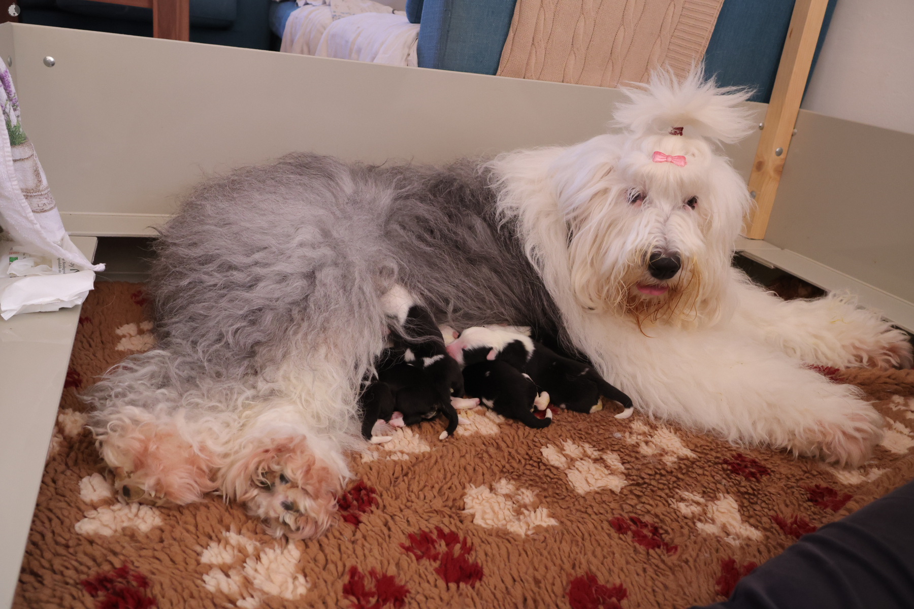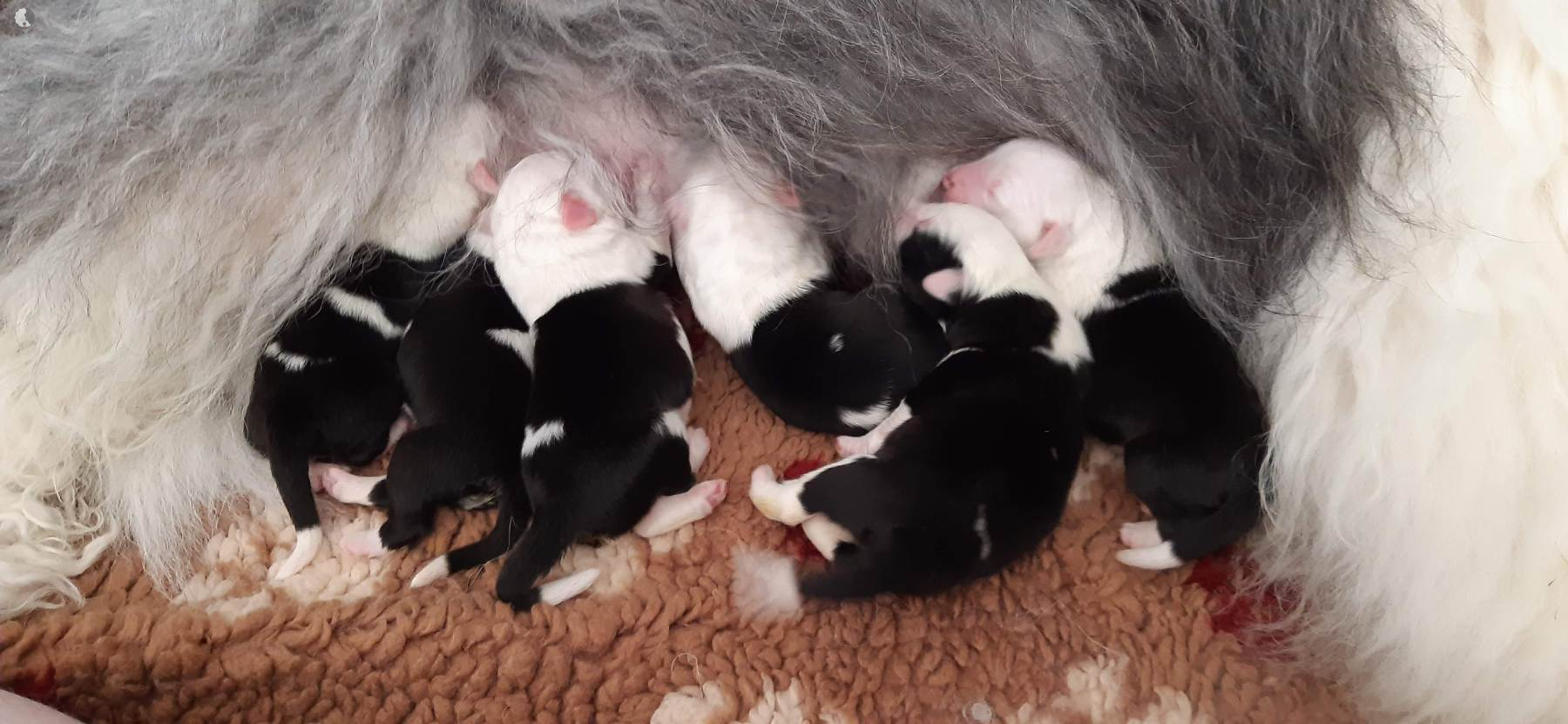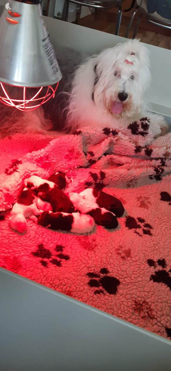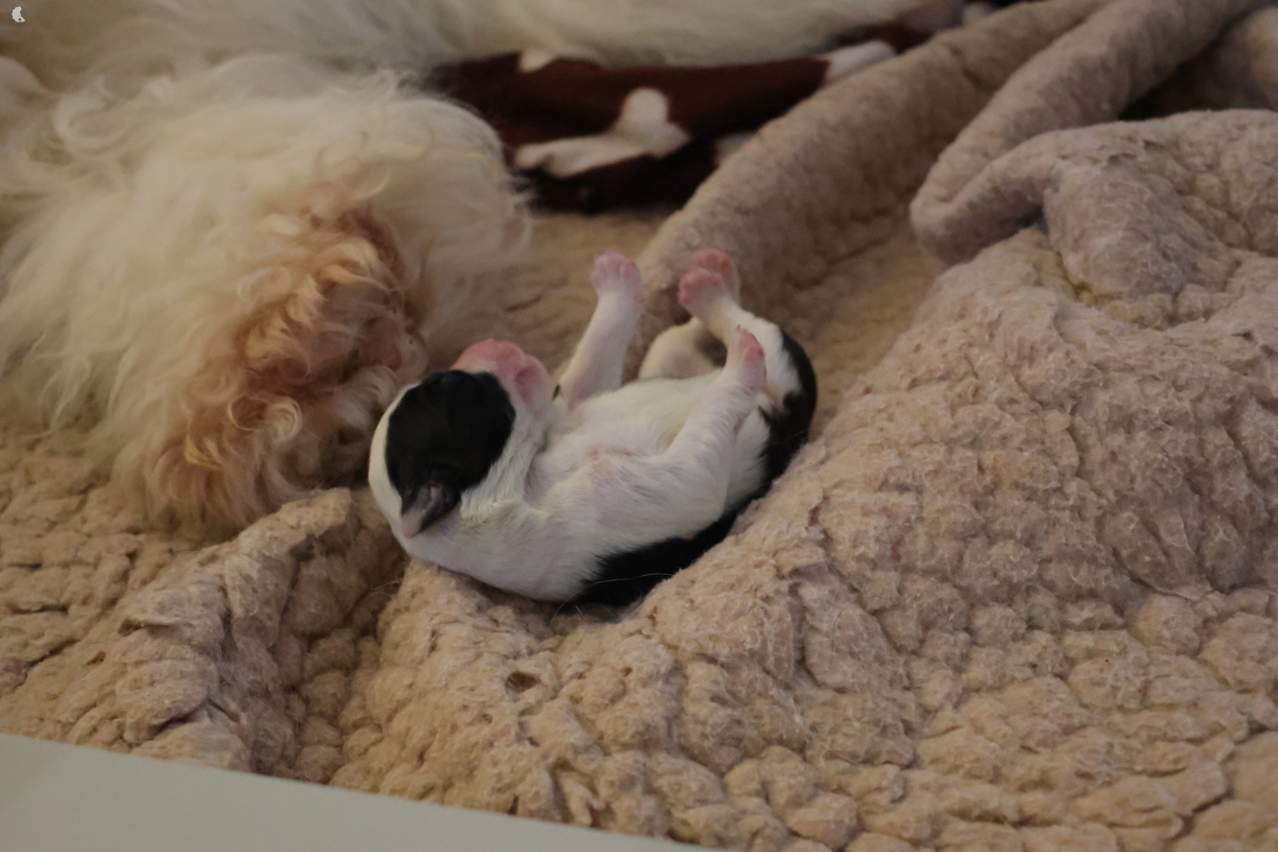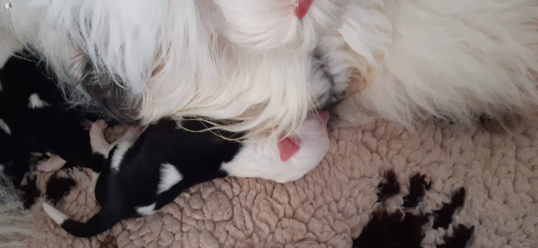 The puppies were born without fetal envelopes, so each puppy immediately had a lot of attention 🙂. Antea retained the placentas, so she received an injection and antibiotics. After 3 days, the sona check showed that the uterus was clean and in order. Antea is a gentle and careful mother, and despite the temperature she had after giving birth, she did not stop taking care of her little ones. Only she was very hot in the box where the red infrared light was shining. Yesterday, Moninka and Lana got acquainted with the girls.