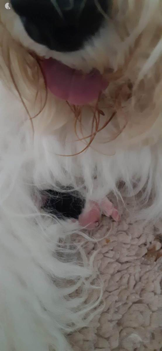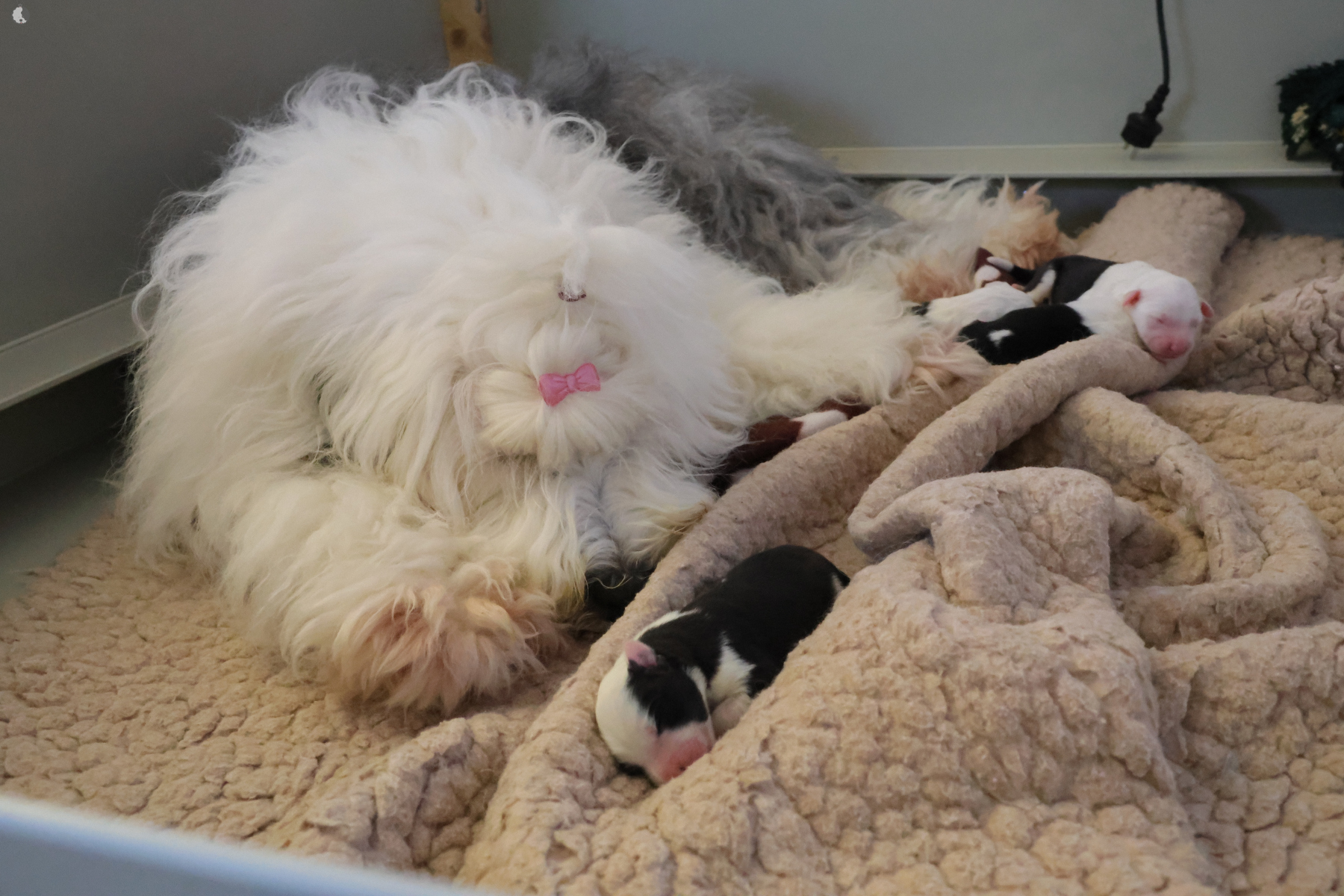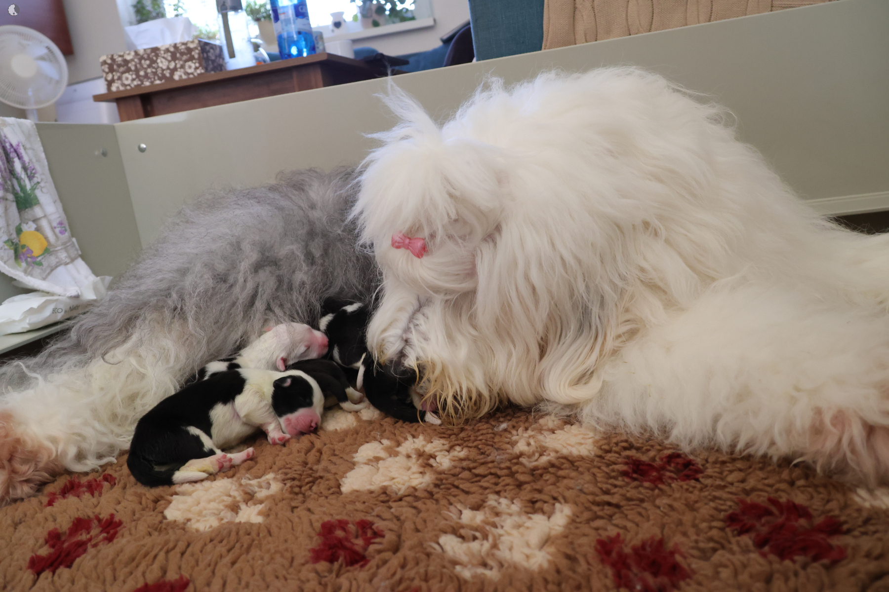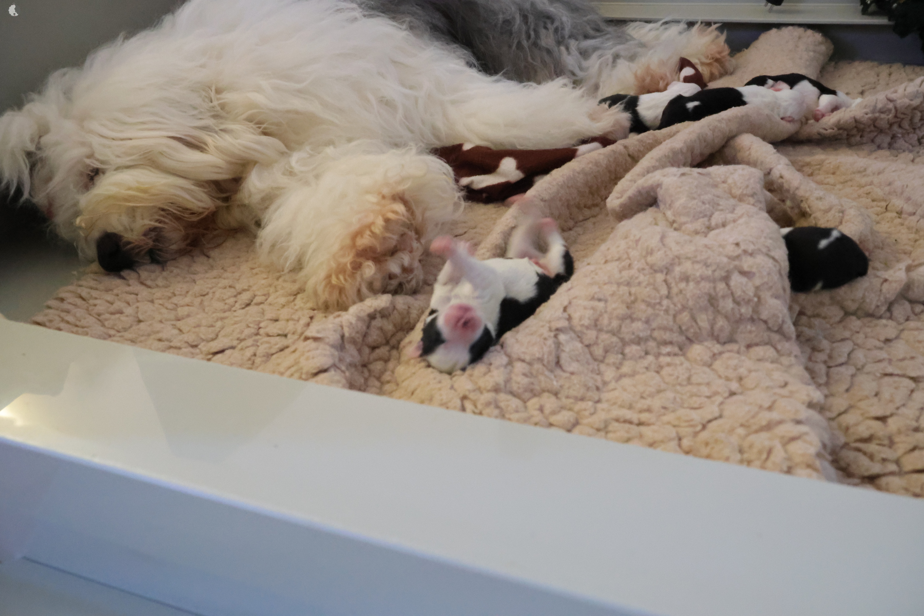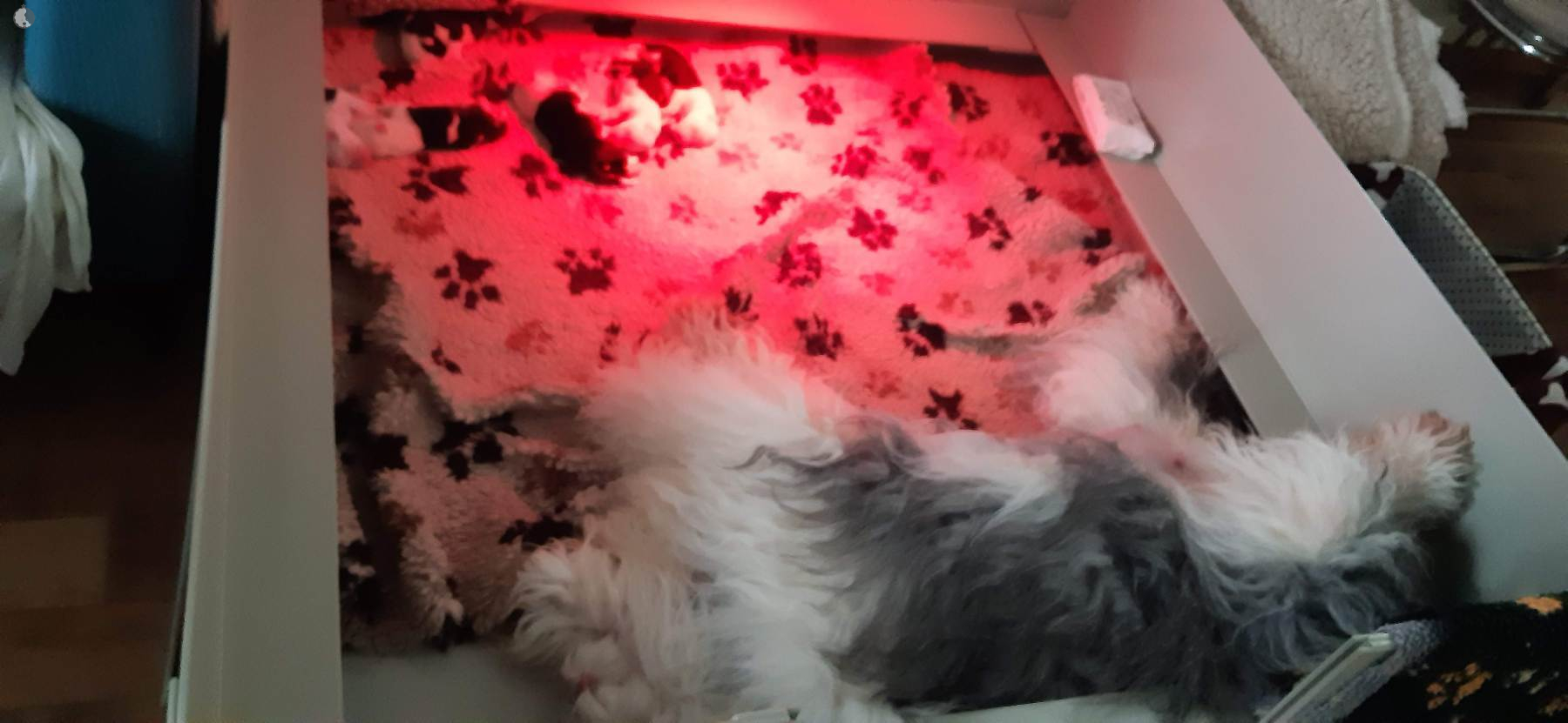 The puppies were born without fetal envelopes, so each puppy immediately had a lot of attention 🙂. Antea retained the placentas, so she received an injection and antibiotics. After 3 days, the sona check showed that the uterus was clean and in order. Antea is a gentle and careful mother, and despite the temperature she had after giving birth, she did not stop taking care of her little ones. Only she was very hot in the box where the red infrared light was shining. Yesterday, Moninka and Lana got acquainted with the girls.