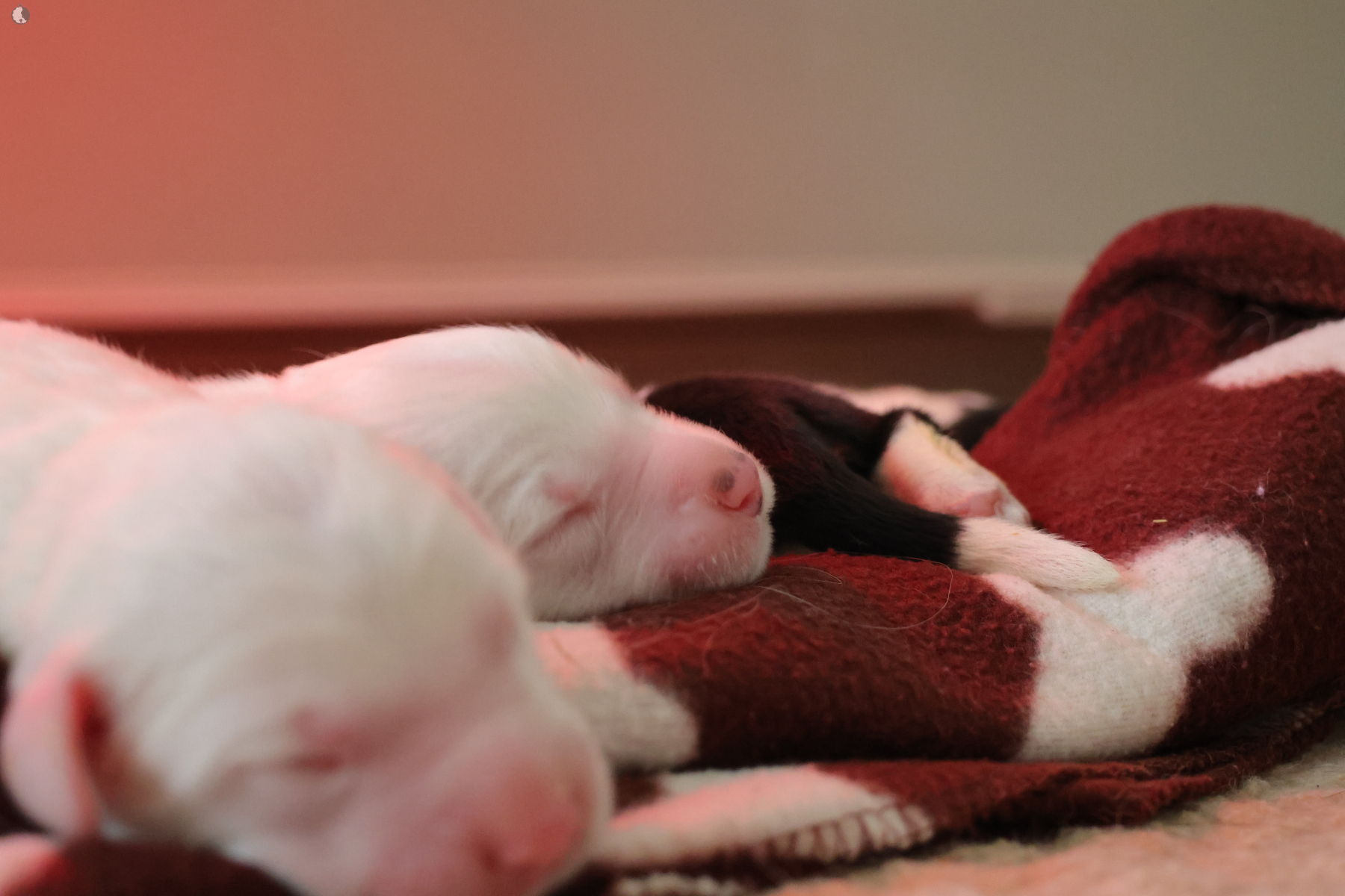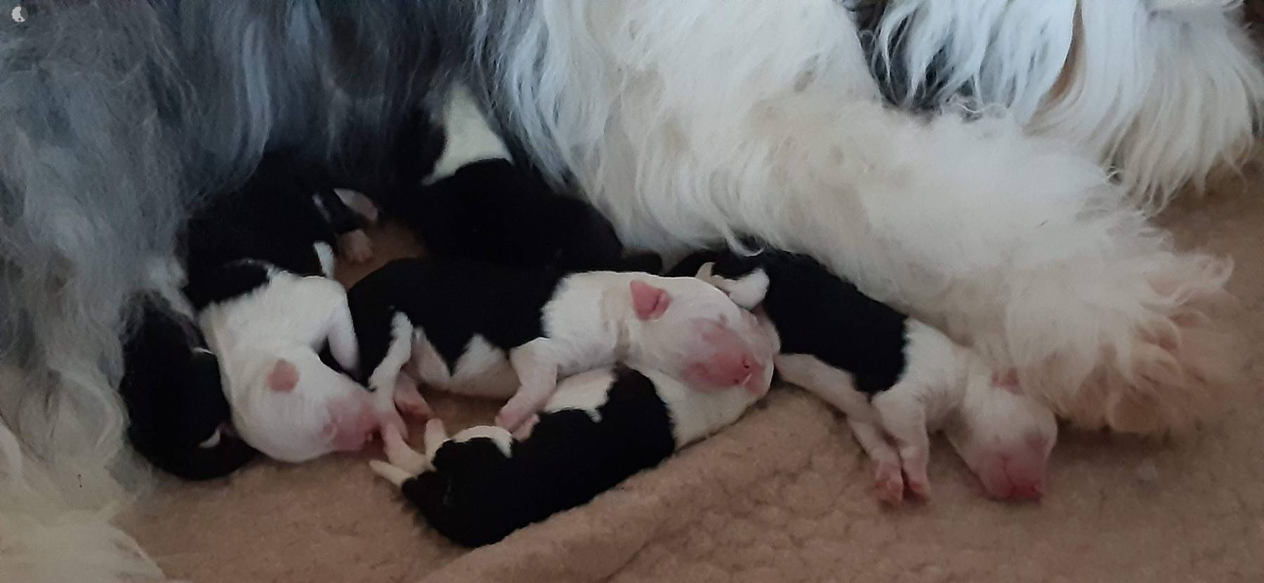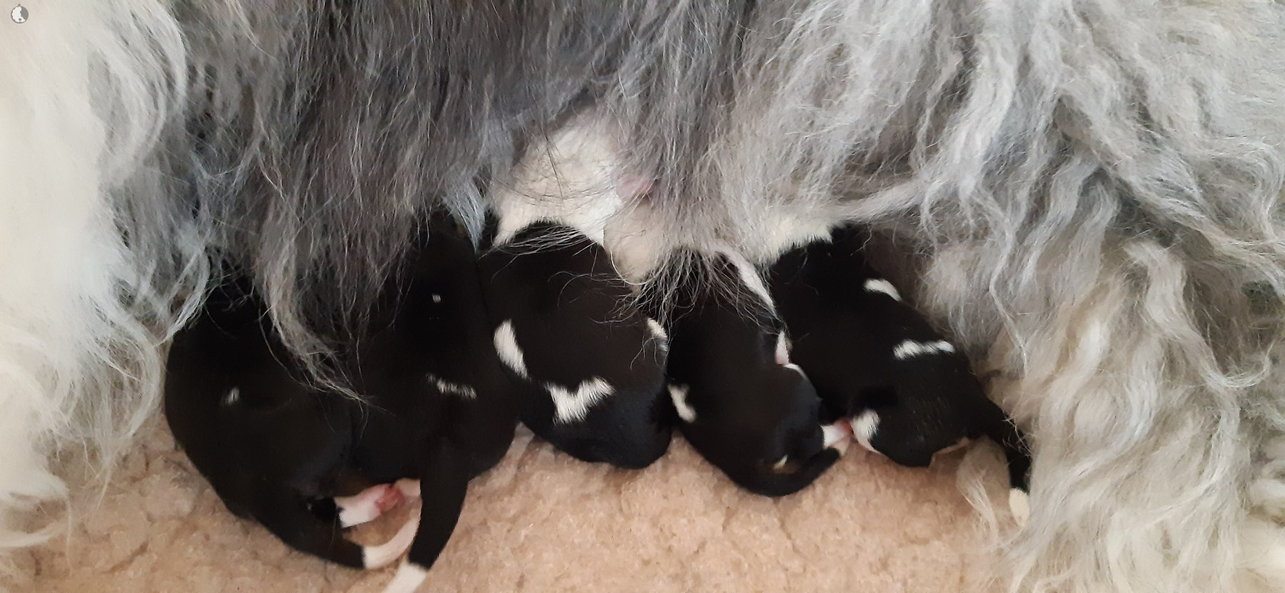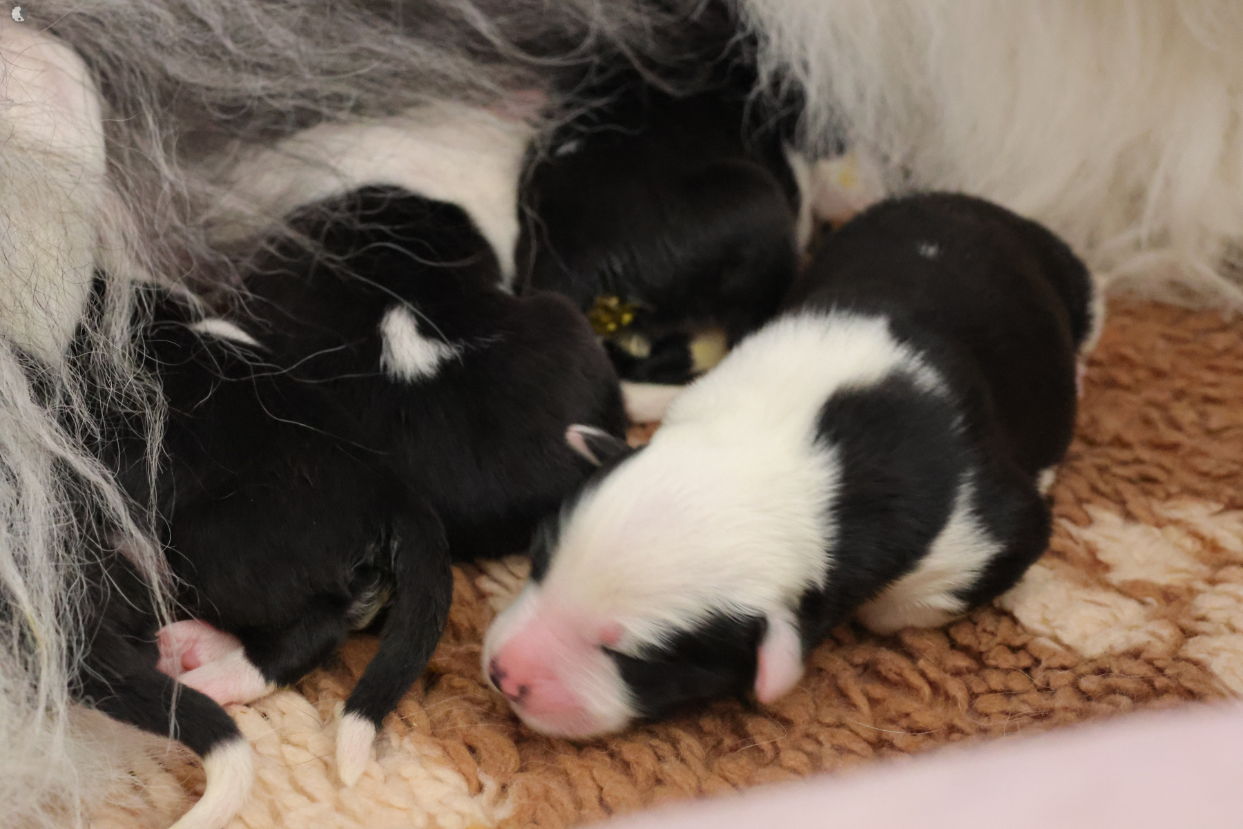 The puppies were born without fetal envelopes, so each puppy immediately had a lot of attention 🙂. Antea retained the placentas, so she received an injection and antibiotics. After 3 days, the sona check showed that the uterus was clean and in order. Antea is a gentle and careful mother, and despite the temperature she had after giving birth, she did not stop taking care of her little ones. Only she was very hot in the box where the red infrared light was shining. Yesterday, Moninka and Lana got acquainted with the girls.